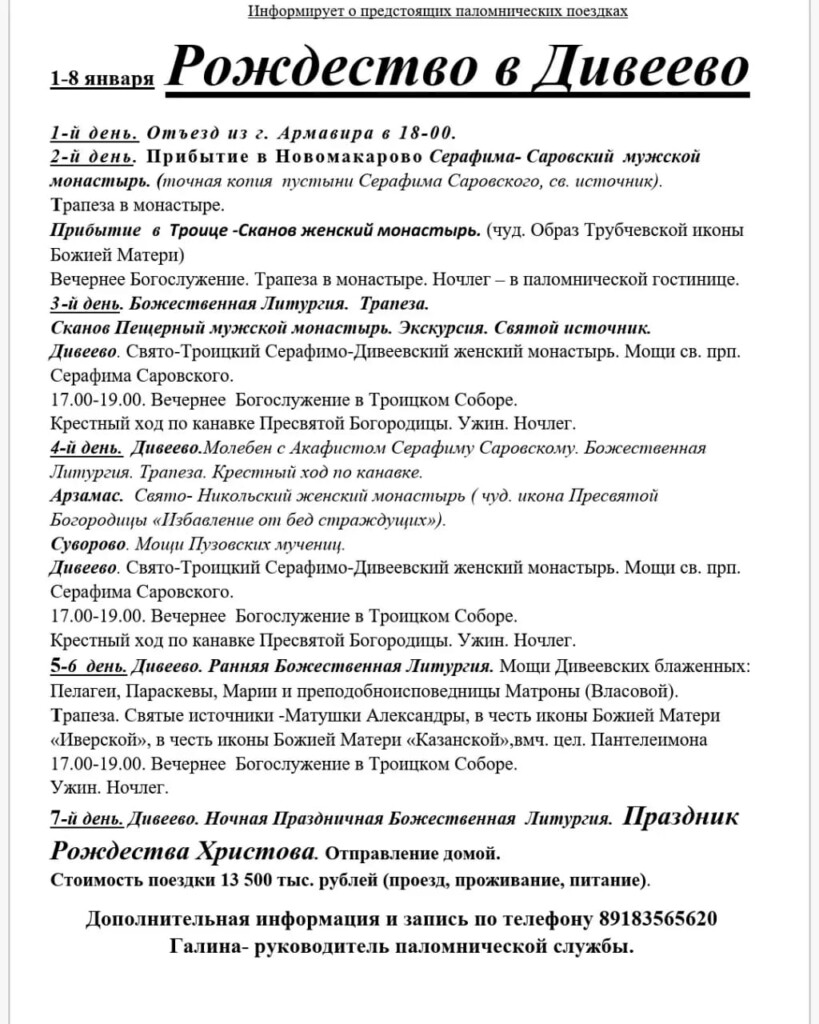 Паломническая служба Армавирской епархии. Предстоящие поездки по святым местам России Добавить комментарий (27) Поделиться:TwitterВКонтактеМой МирОдноклассникиGoogle